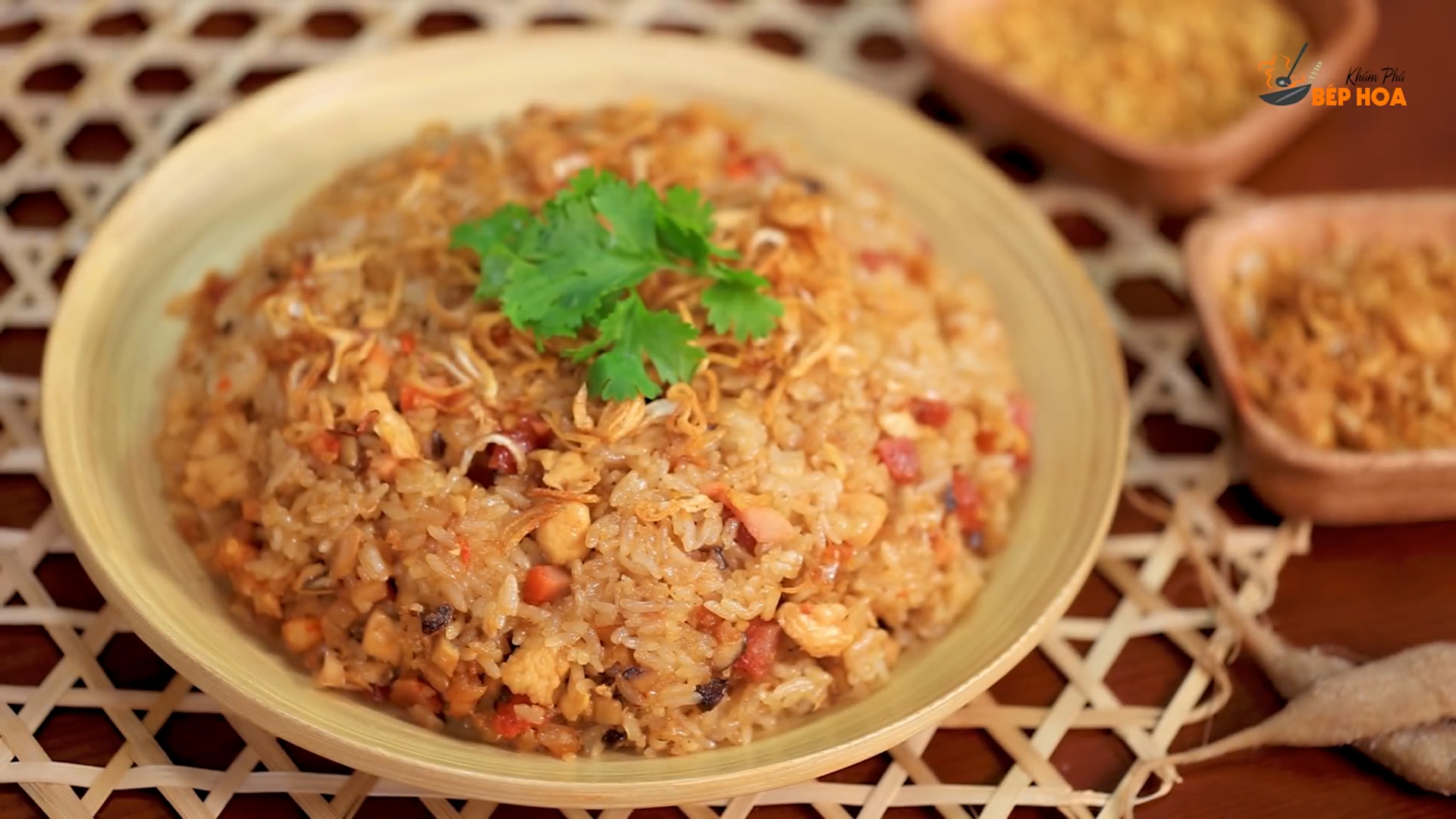 – Cho nếp nấu chín + đổ thịt xào vào, trộn đều, múc ra dĩa ém mặt cơm cho phẳng, gắn hột đều khắp mặt cơm. Phết trứng lên mặt cơm. Đem đút lò cho đến khi nếp vàng mặt.