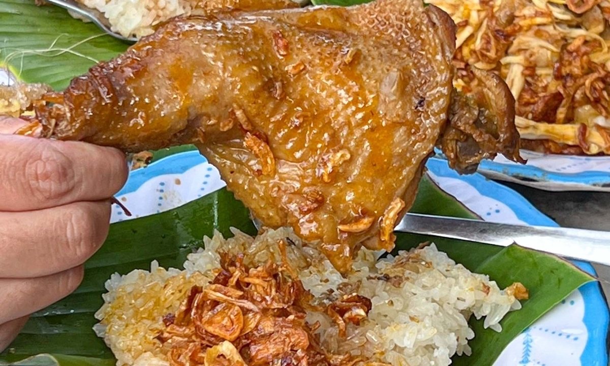 - Trút đùi gà lên đĩa cơm nếp, tưới mỡ hành lên trên và ăn nóng.