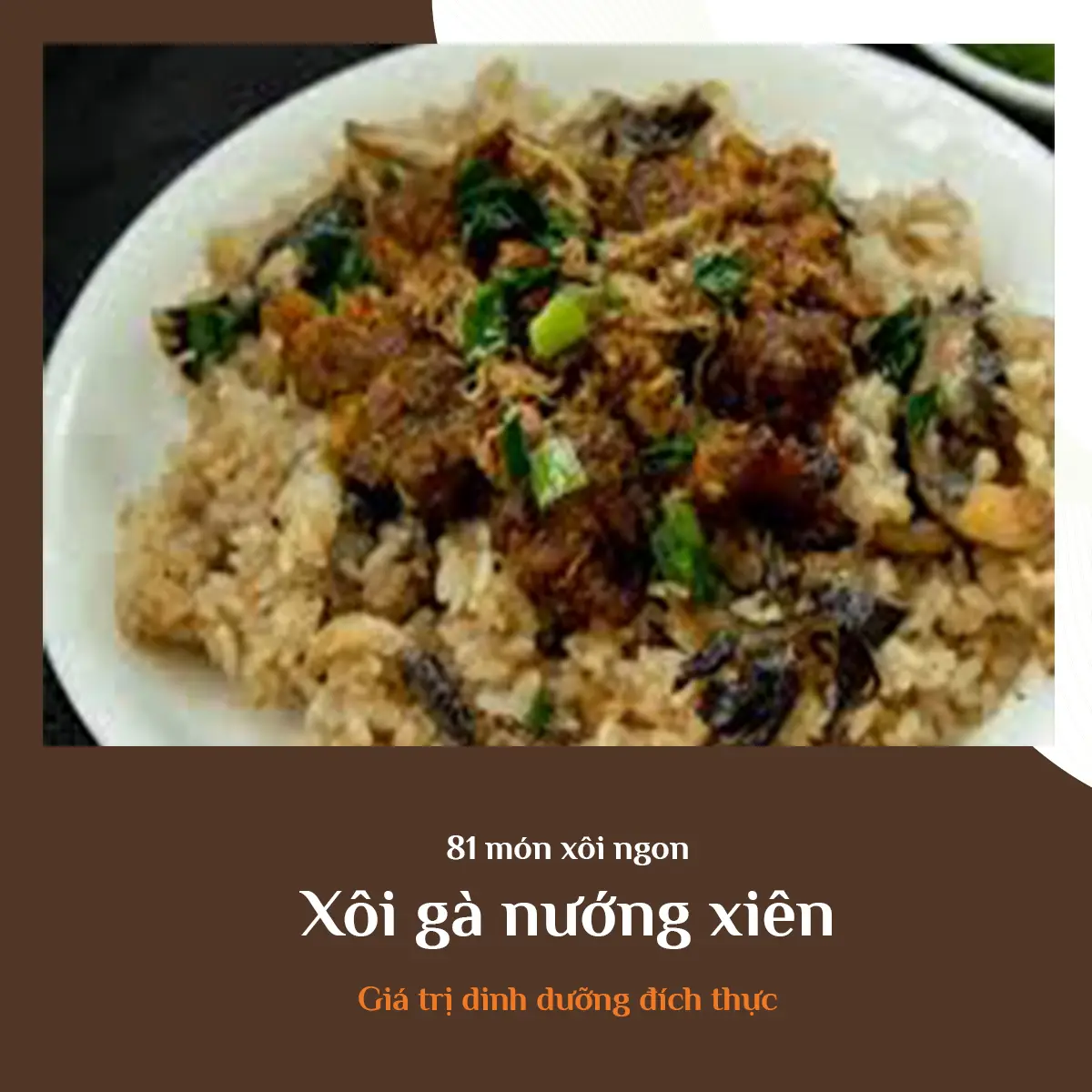 * Xếp các xiên thịt gà nướng vào cạnh xôi, rưới nước sốt lên thịt, dọn dùng nóng.